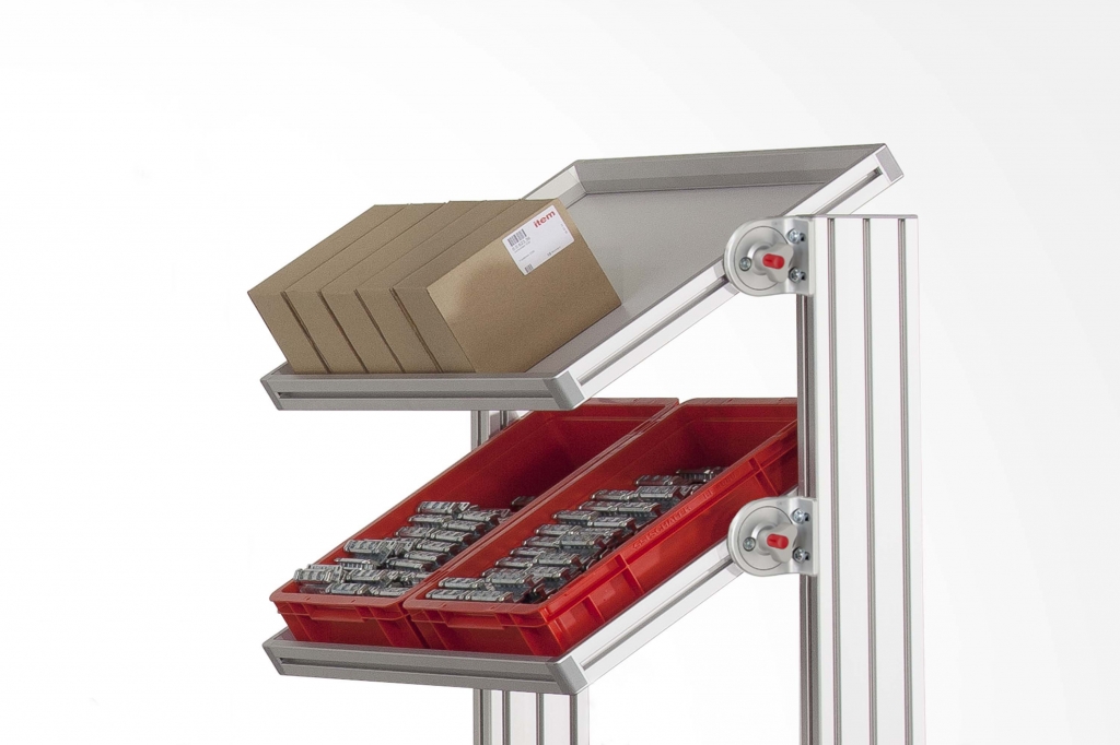 Trays ESD come in two versions – F and A. Version F is installed at a fixed right angle while version A features an integrated angle locking bracket so that it can be set at an oblique angle. The ability to accurately reproduce angle settings enables users to precisely calibrate material feed when material supply is being organised according to the pull principle. The raised edge of the tray prevents objects from falling off.