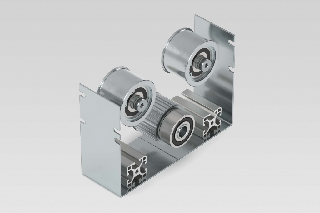 The set comprises the Drive Pulley with T5 tooth shape, two Return Pulleys, two covers 8 40 M and two profile cut-offs for extra rigidity. Drive Unit Set 8 40 M (0.0.725.72) acts as a bearing and fixing for the components. The necessary fixings are included with the Drive Unit Set.