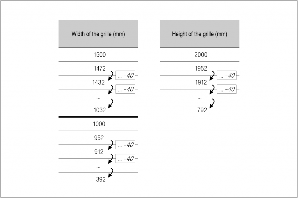 The following grid pattern is required for the design and assembly of the Steel Mesh Fixing Block 8 Zn (0.0.725.22) in the system groove 8 when cutting Steel Mesh 3.8 mm 40×40, black (0.0.428.39).