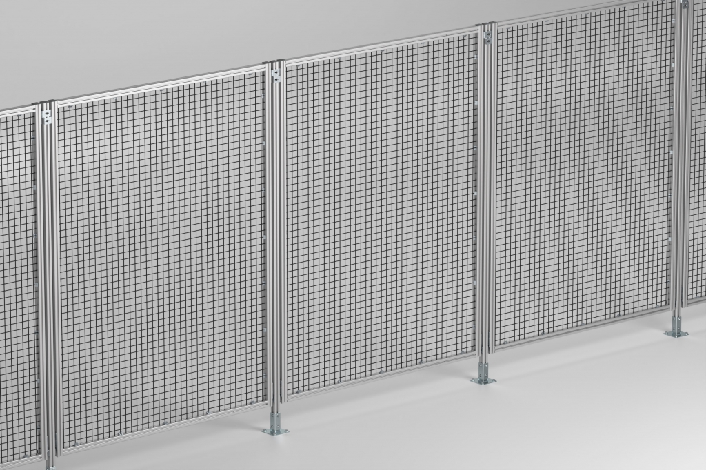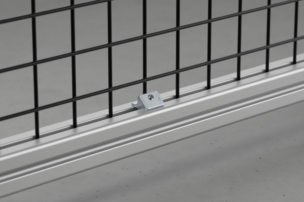 Steel Mesh Fixing Block 8 Zn fastens mesh with a wire diameter of 3.8 mm to a Line 8 groove without requiring any machining work. The mesh fixing element helps ensure enclosures and guards with a Steel Mesh infill can be built efficiently.