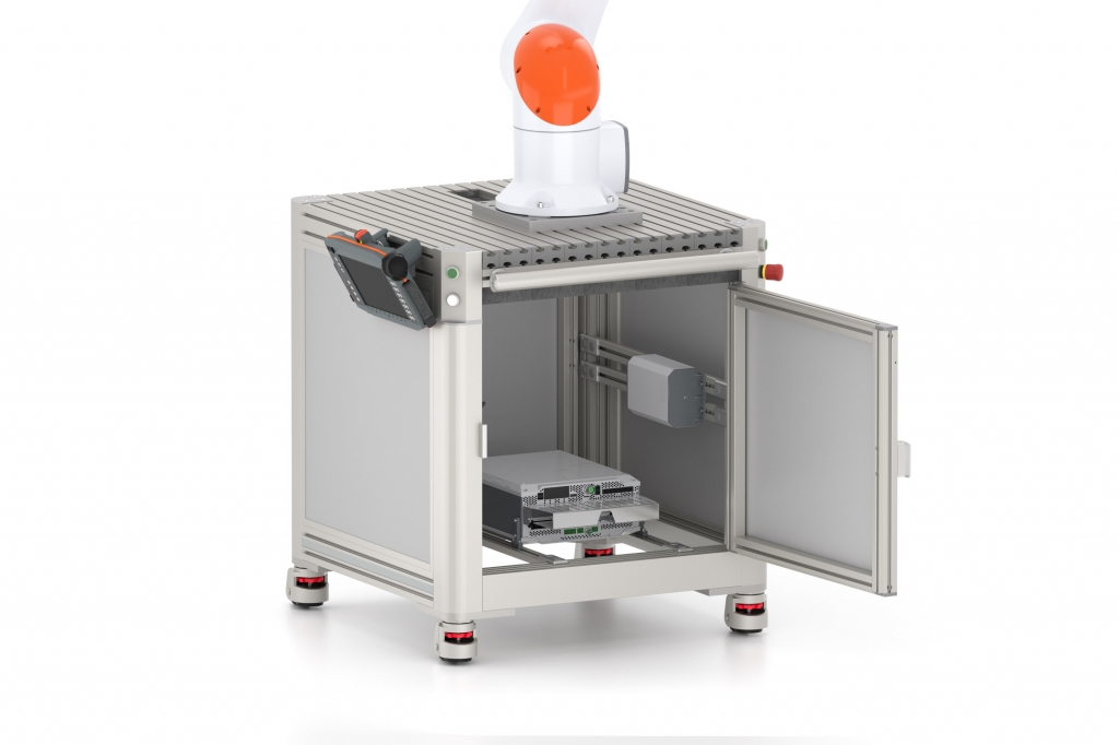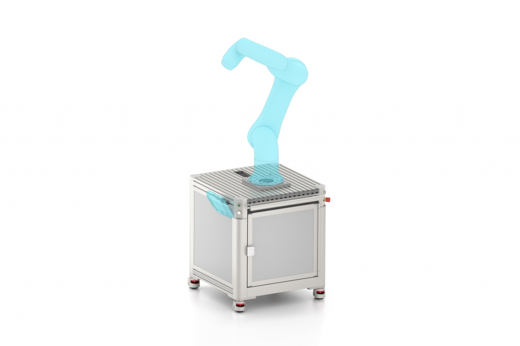 The compact robot island combines mobility with the convenience and safety of a lockable base cabinet. The electrics can be stored here safely and protected from dust. All operating elements are integrated into the frame. Cables can be routed to the robot arm through a central brush strip. The item Groove Plate creates a versatile work surface.