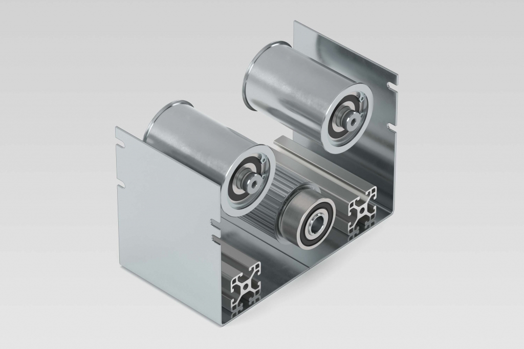 组件包括 T5 齿形传动轮、两个从动轮、两个盖板 8 系列 40 M 和两根提升刚性的切割型材。传动装置组件 8 系列 40 M (0.0.725.72)可充当零部件的轴承和固定件。必要的固定件都包含在传动装置组件中。