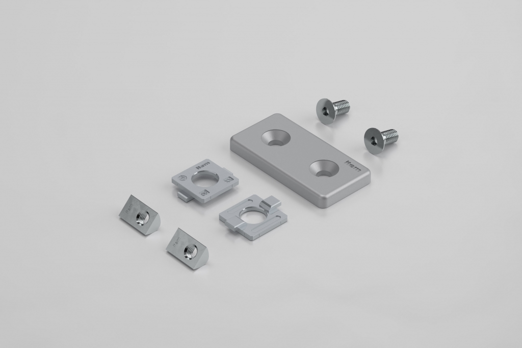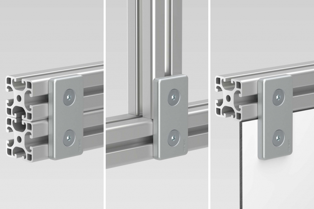 平板连接件组件 8 系列 2V 80x40 有两个带抗扭模块的衬垫,可通过两个 8 系列槽轨实现平行型材的抗扭连接。此外,这款连接件还能将面板元件固定在型材上。