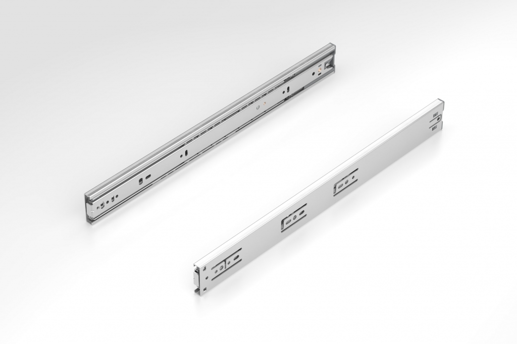 全拉伸伸缩导轨可固定在有 5、6 或 8 系列槽轨的型材上,也可安装在面板元件上。它们可用来创建带抽屉的定制台下柜以及带拉出式托盘的人体工学服务推车。