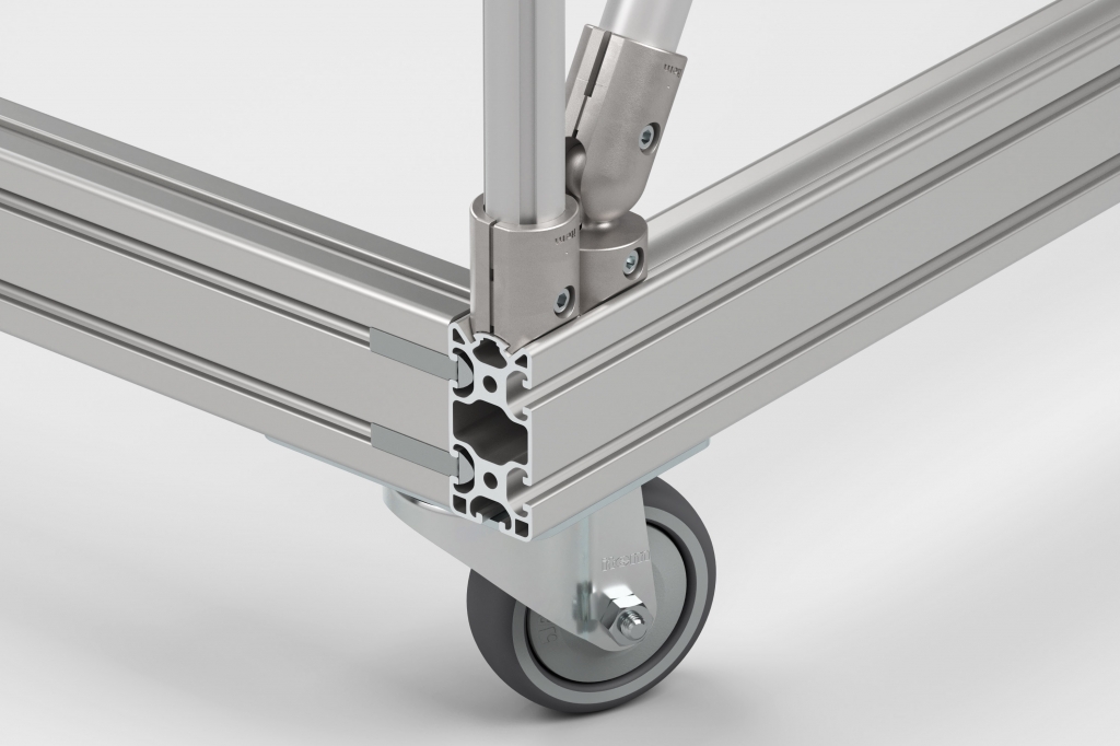 抗扭型材 8 系列 80x40 1N D30 轻型可用来搭建运输推车、移动支架和底座(适用于移动式工业机器人)的承重框架。借助其特殊的几何形状,用户可直接连接型材精益管 D30 搭建的上部结构和顶部模块。
