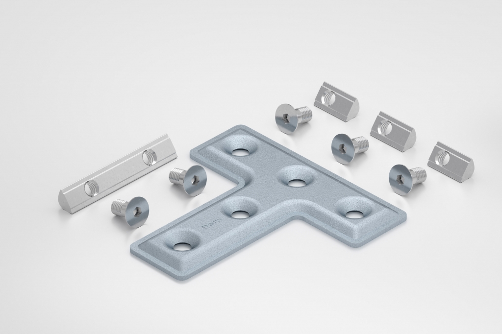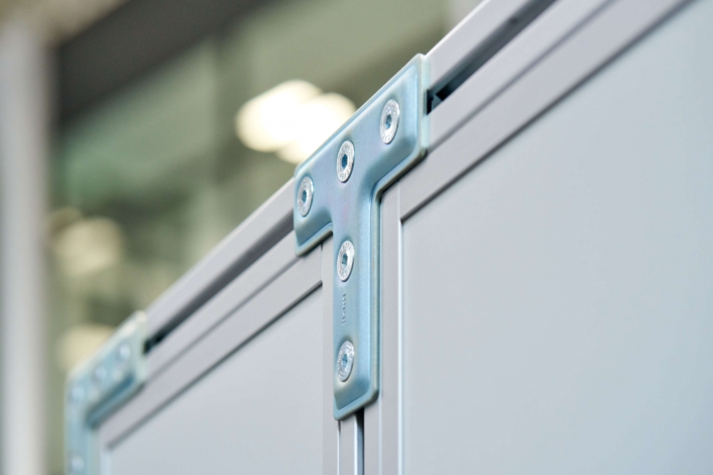 item 连接板让铝型材的连接更牢固。这些坚固的钢板安装在型材的外侧,并且无需额外的机械加工就能为暴露在外的型材提供防冲击保护。