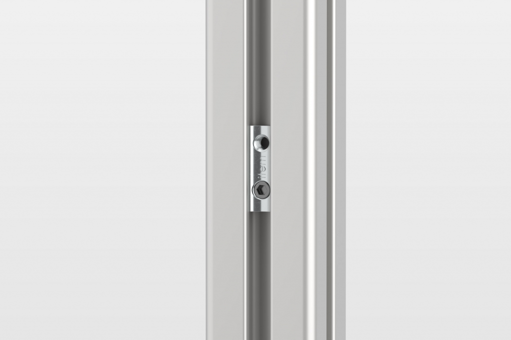 预先固定 T 型槽螺母 F,您就能准确、快速且轻松地组装大型结构,比如洁净室和机柜等。为此,请在型材槽轨底部的指定位置钻一个孔,以便为每个 T 型槽螺母 F 的弹簧球提供定心点。无头螺钉与槽轨之间的摩擦连接还能增强 T 型槽螺母的抗位移能力。